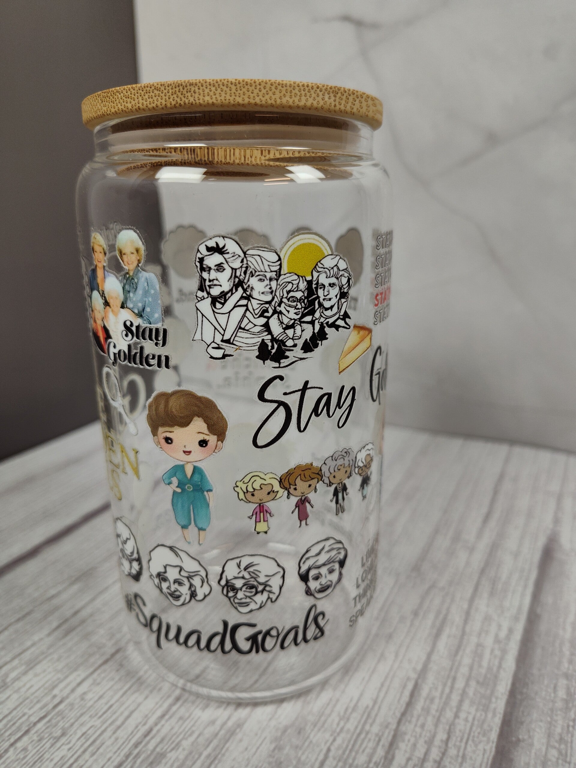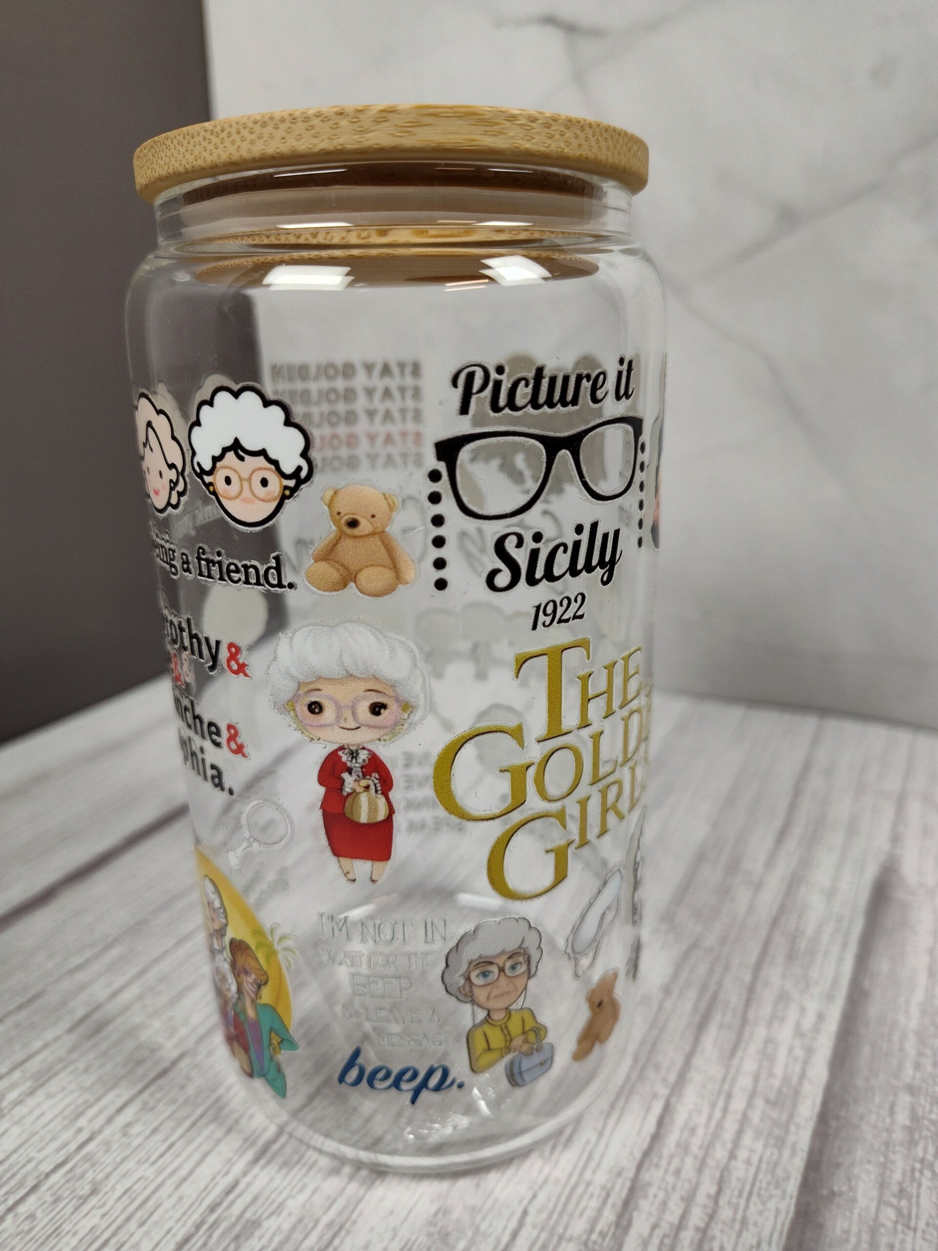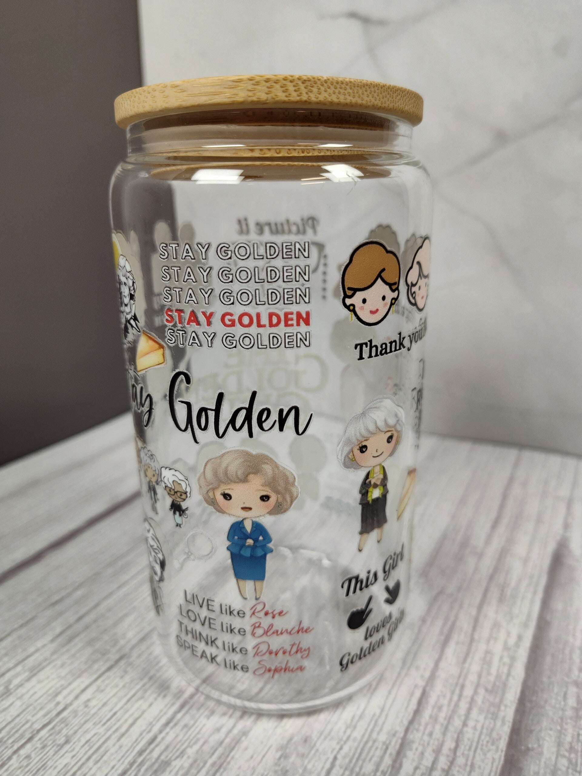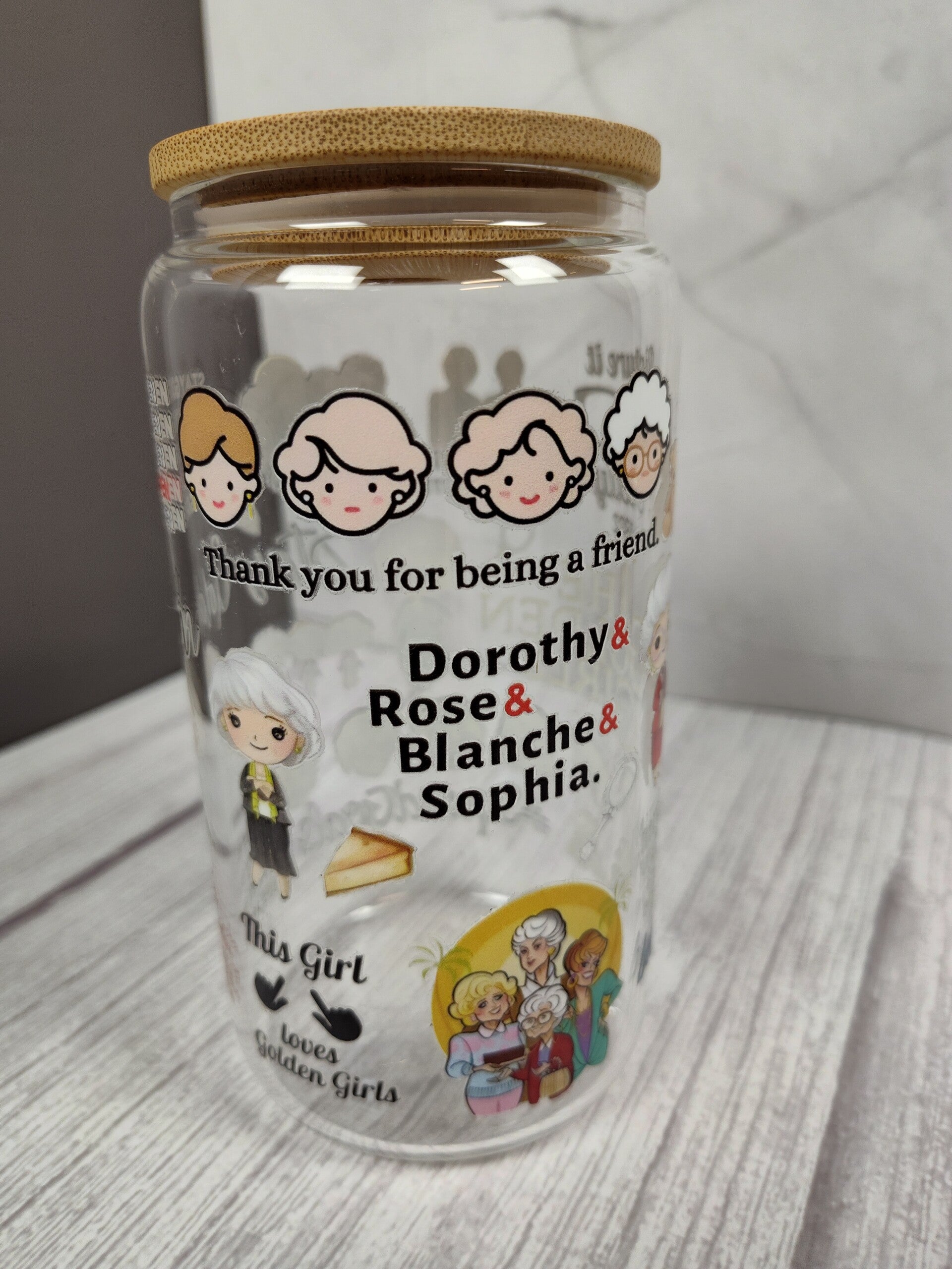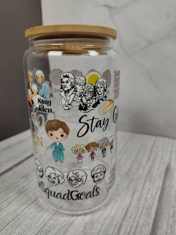 The Golden Girls 16oz glass tumbler. Comes with a bamboo lid, straw and box.