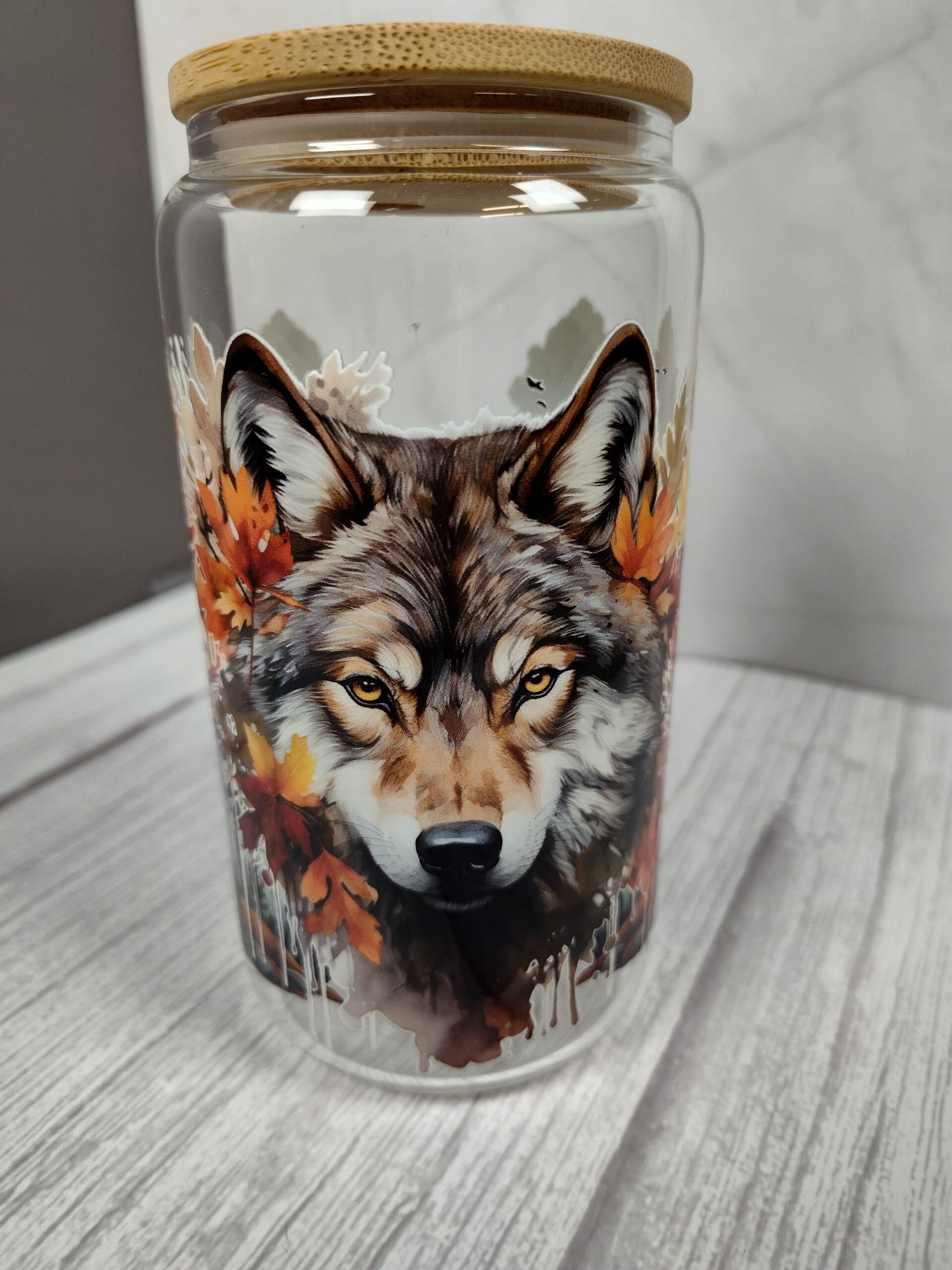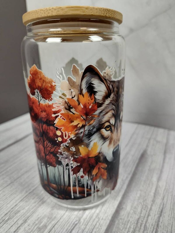 Wolf 16oz. glass tumbler. Comes with a bamboo lid, straw and box