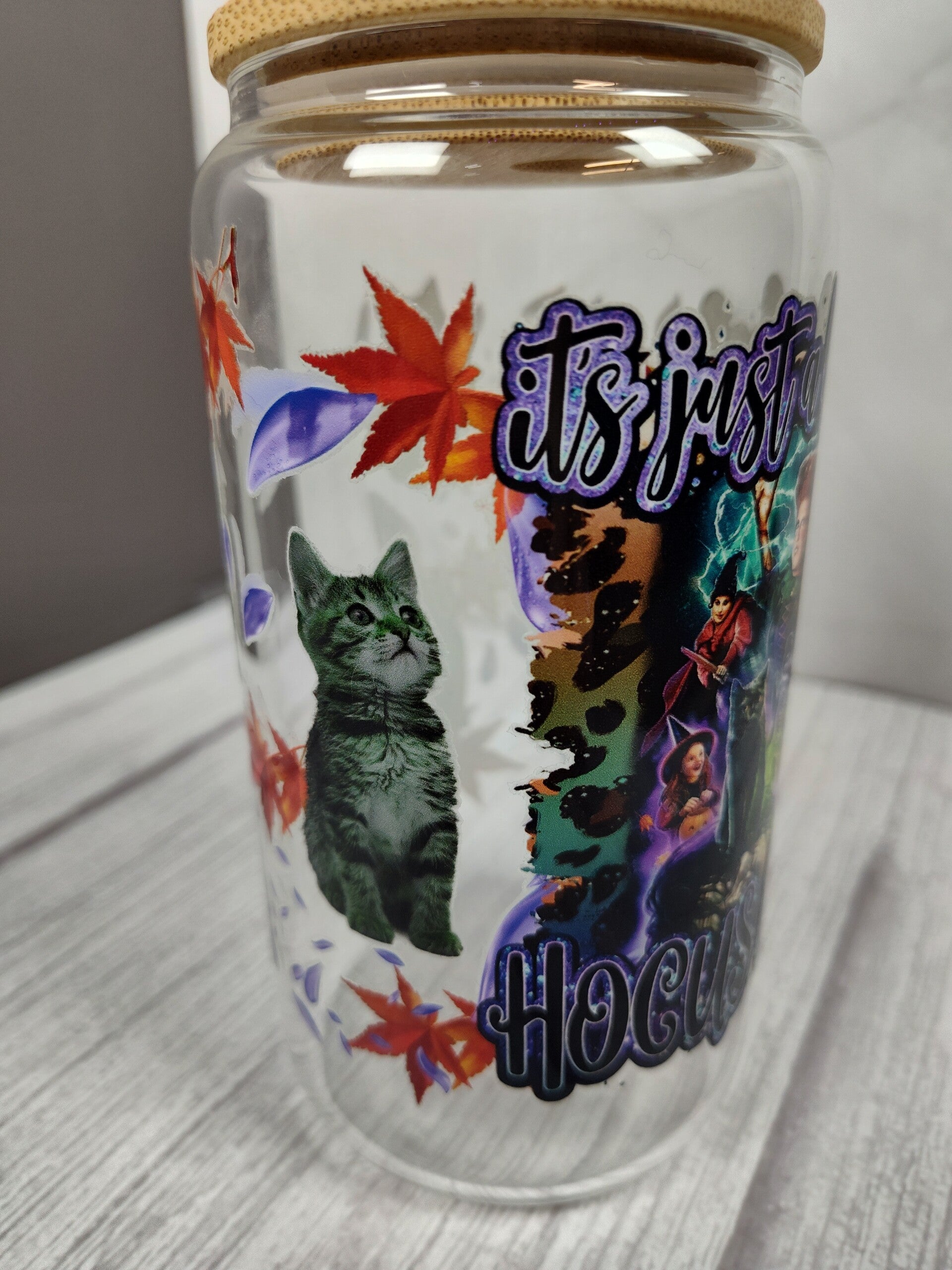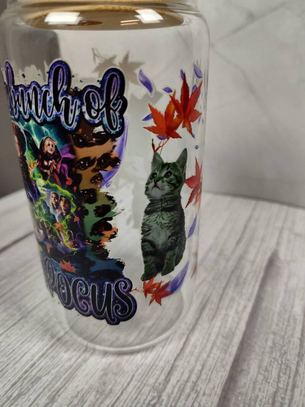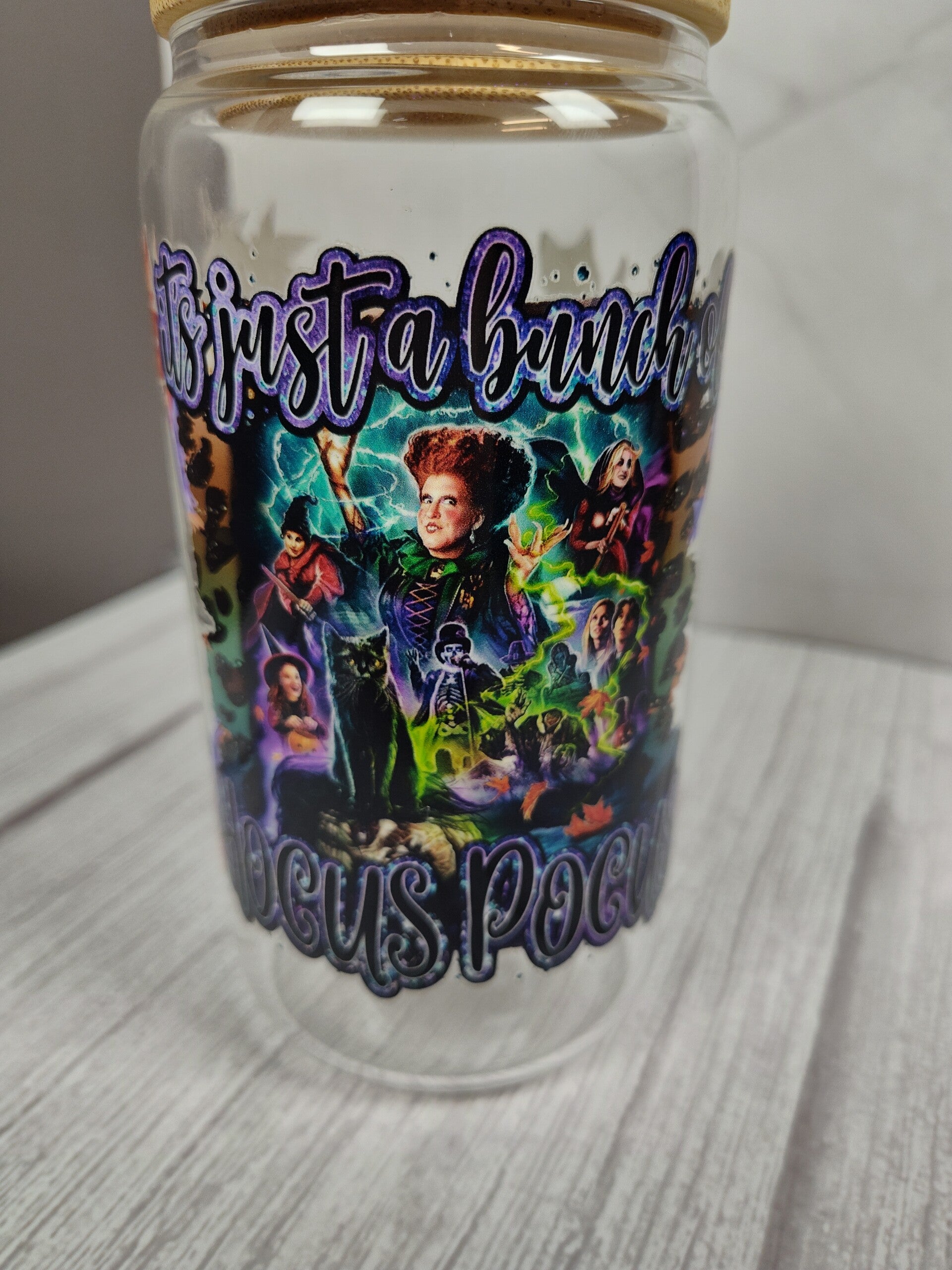 Hocus Pocus 16oz glass tumbler. It's all a bunch of hocus pocus. Comes with a bamboo lid, straw and box.
