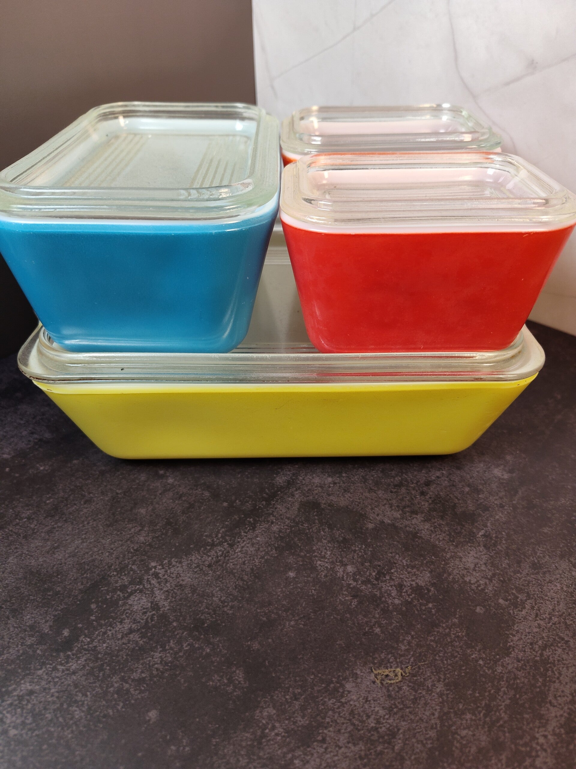 Vintage Pyrex Primary fridgie set comes with 4 containers and 4 lids.
