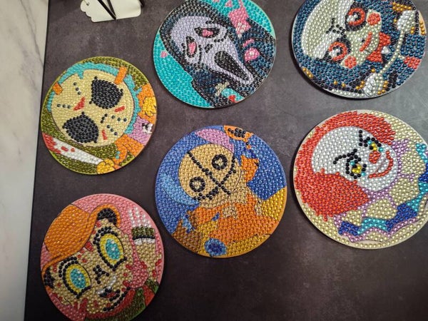 8 Diamond art horror movie coasters. All have been sealed and have a cork backing and holder. 4 inches each.